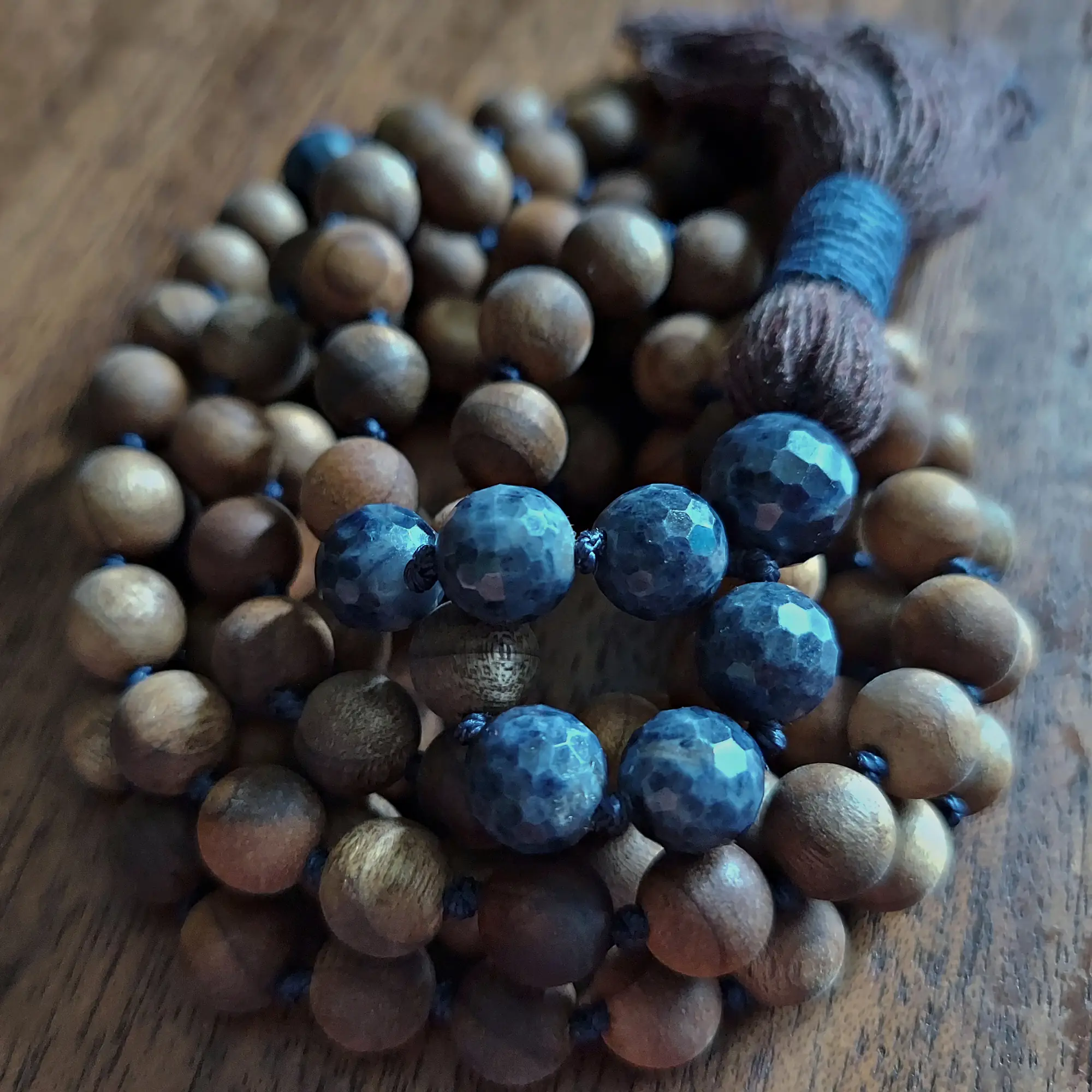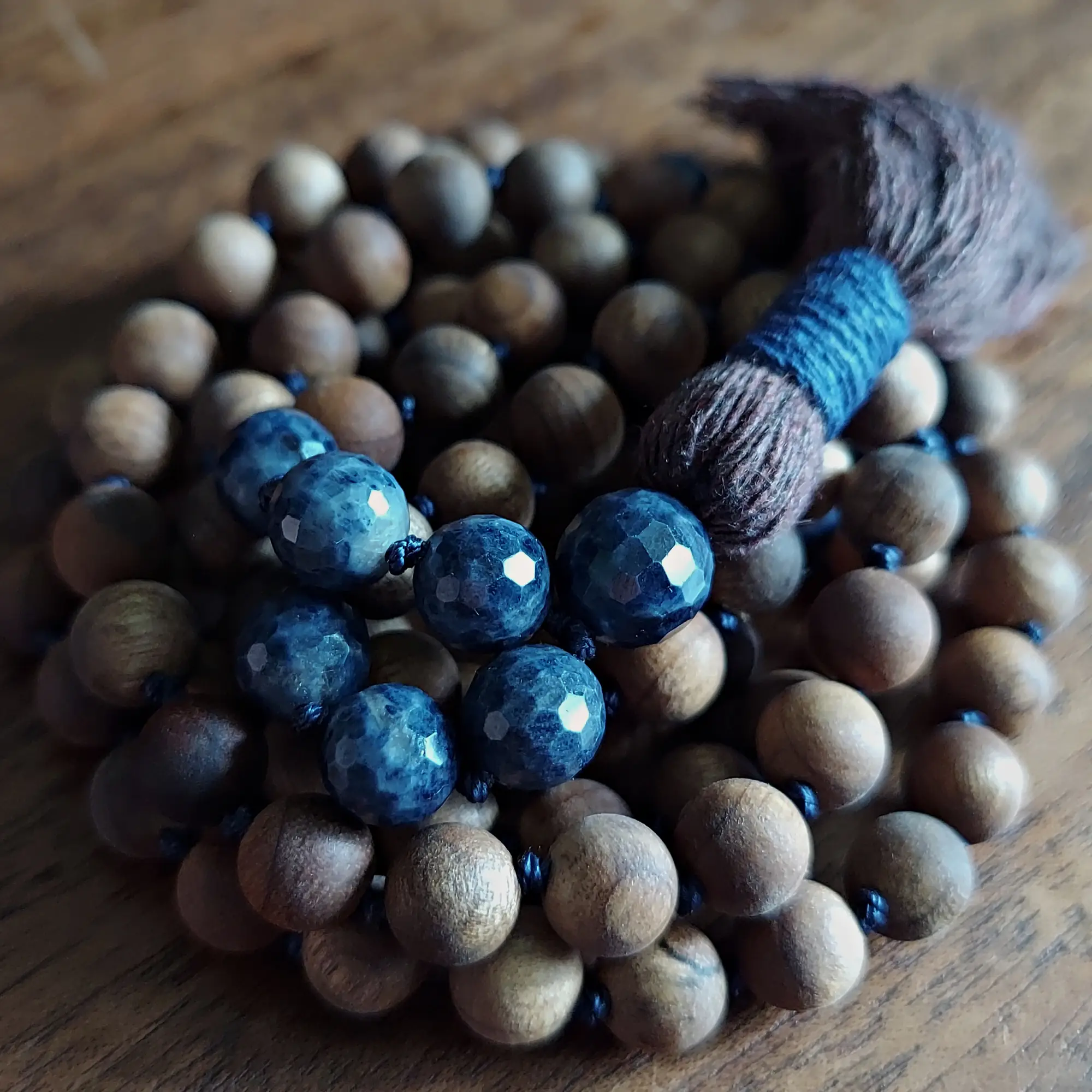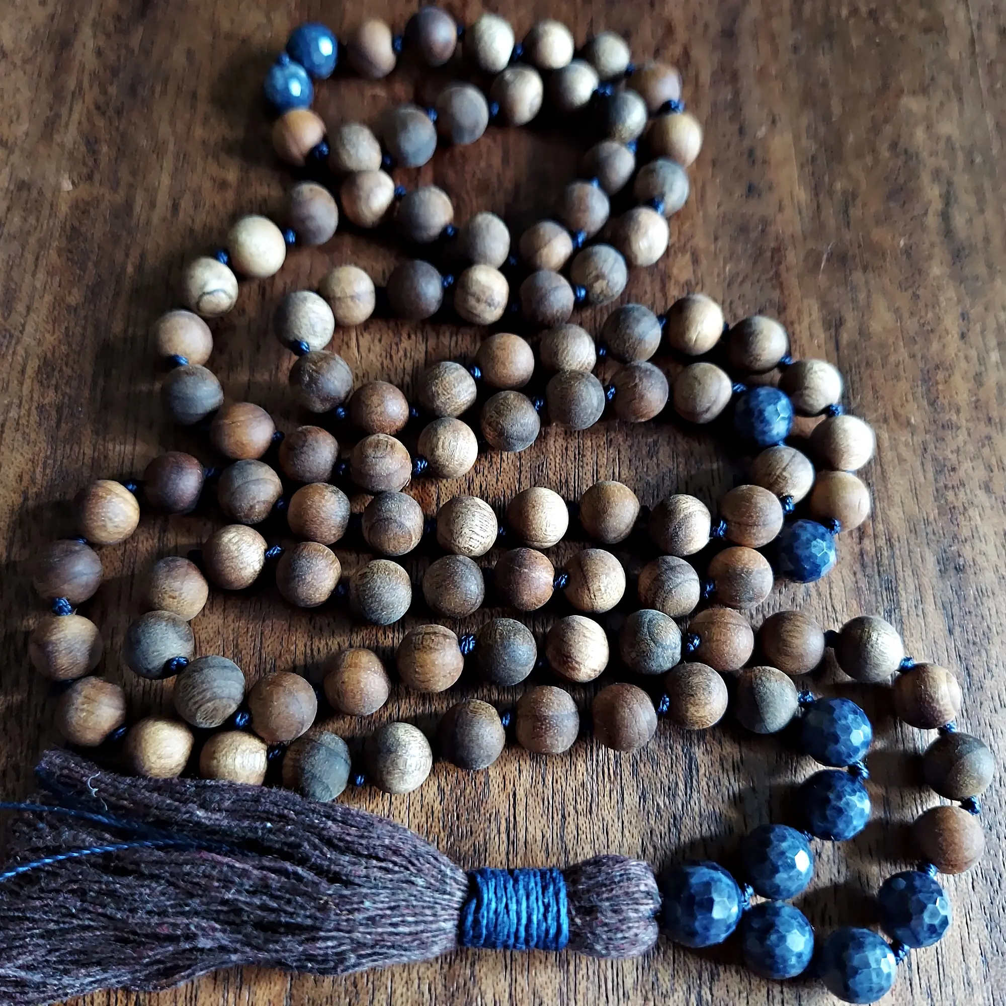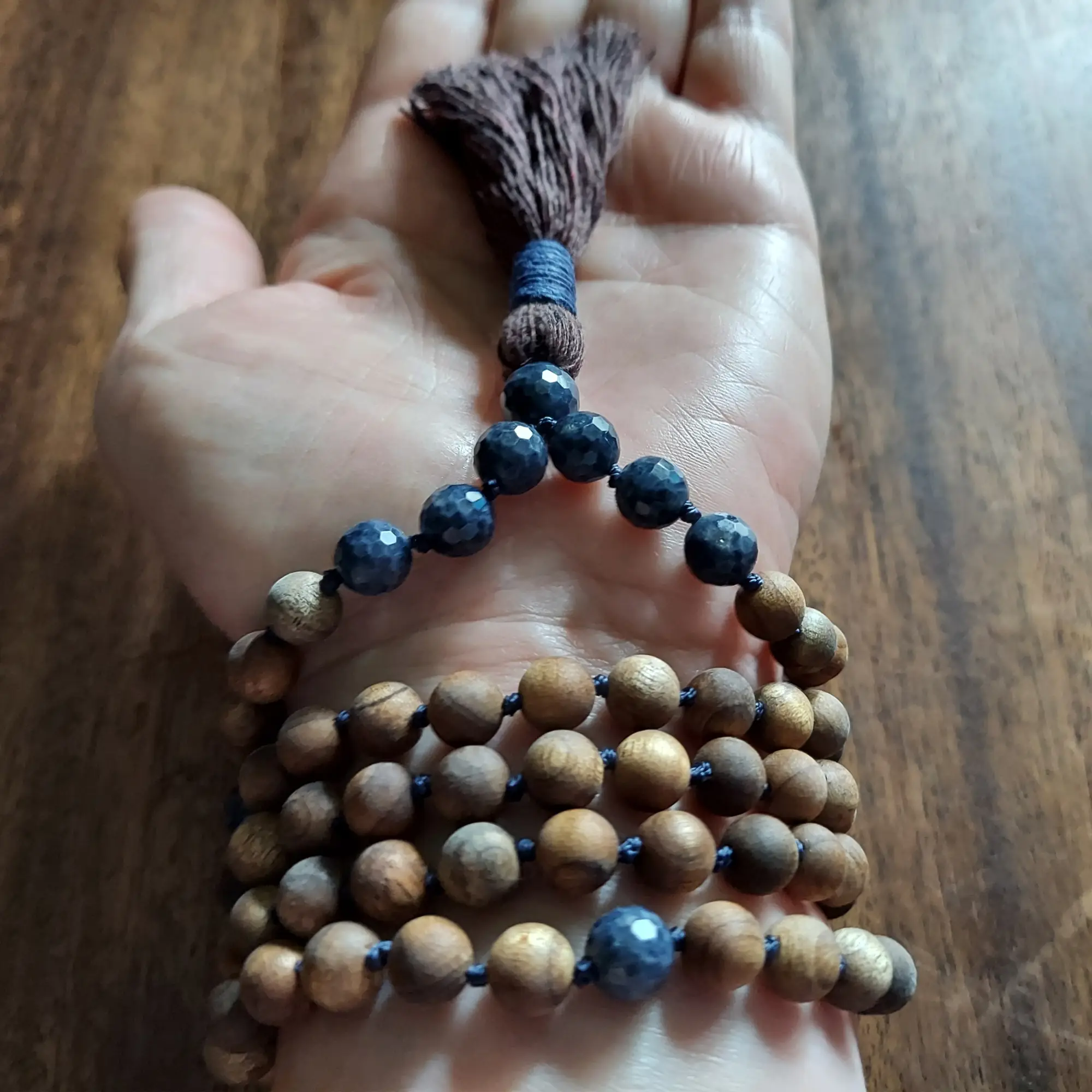 Find serenity and authenticity with this Genuine Sapphire and Sandalwood Mala Necklace.