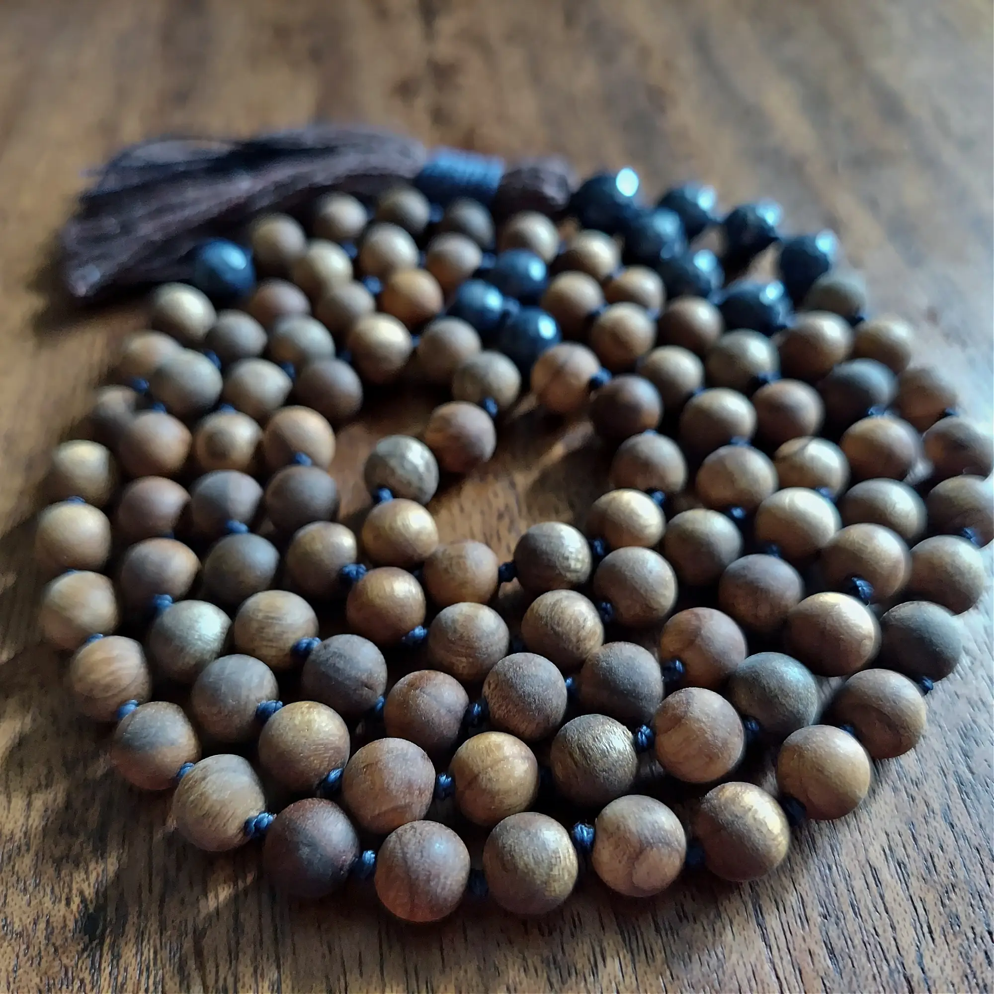 Your mala beads will include a cotton tassel and nylon cord for knots, which, unlike silk, does not rot, stretch, or fray. Cotton & nylon are far superior for something we handle and wear daily.