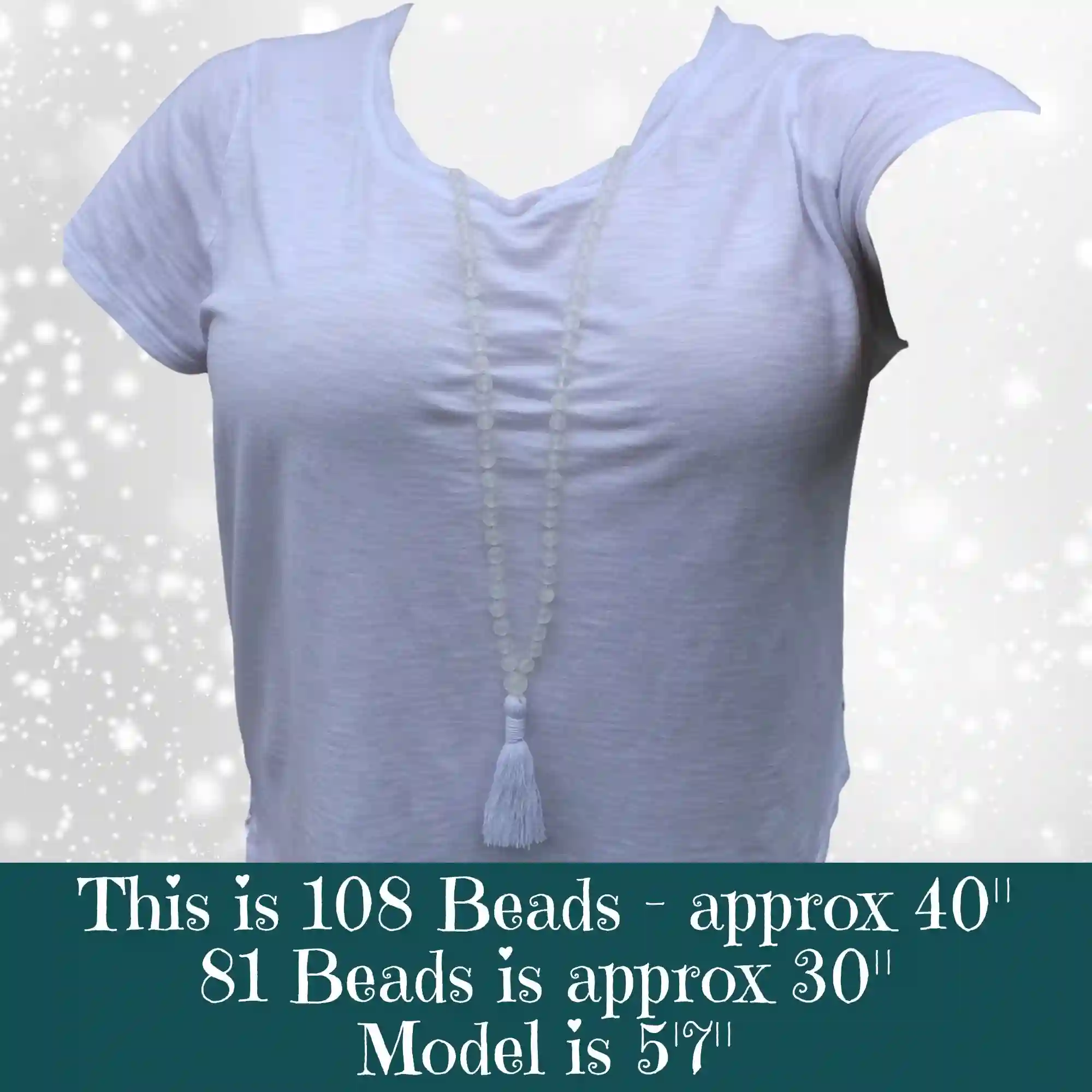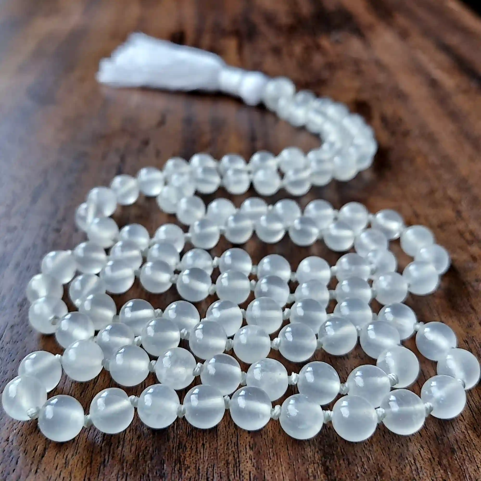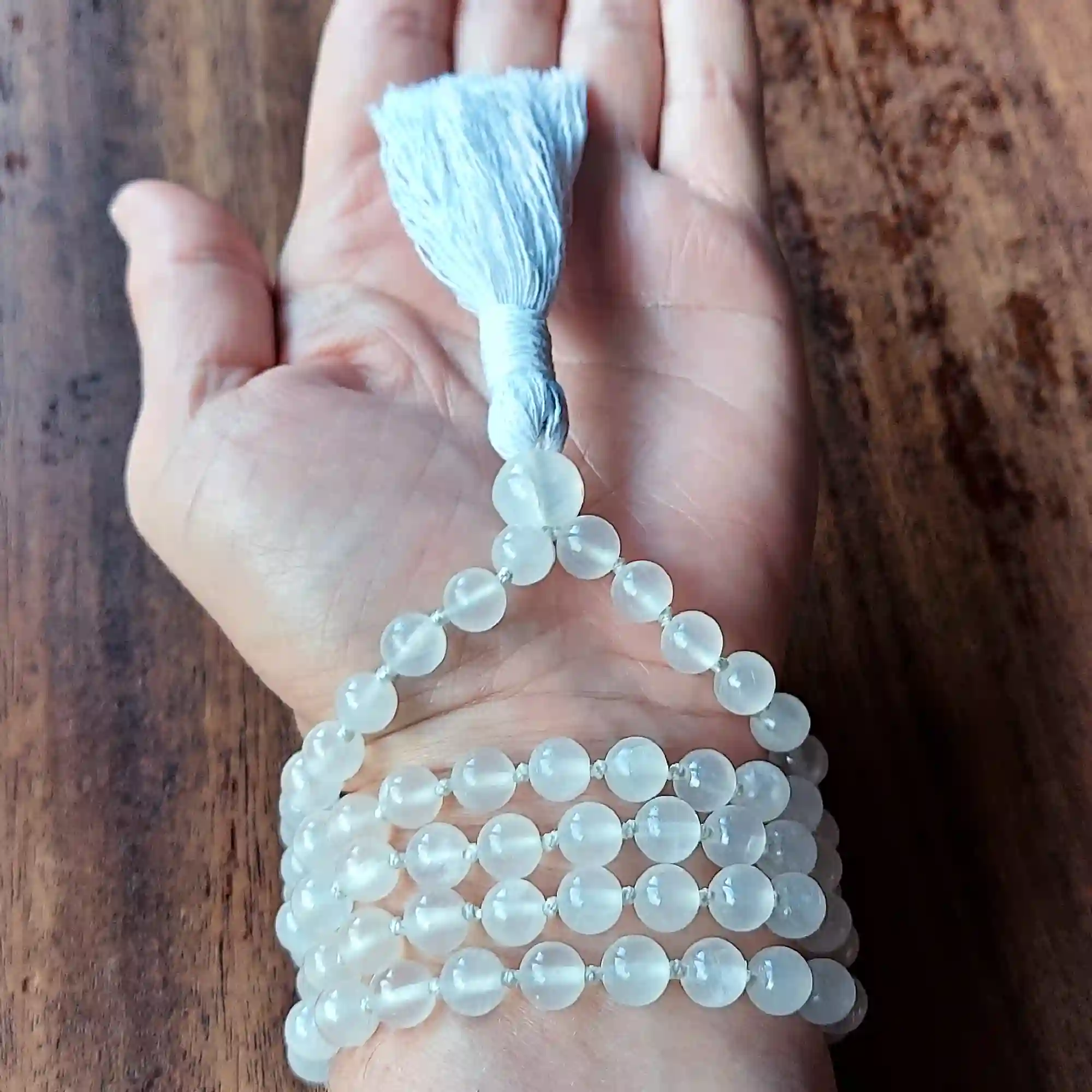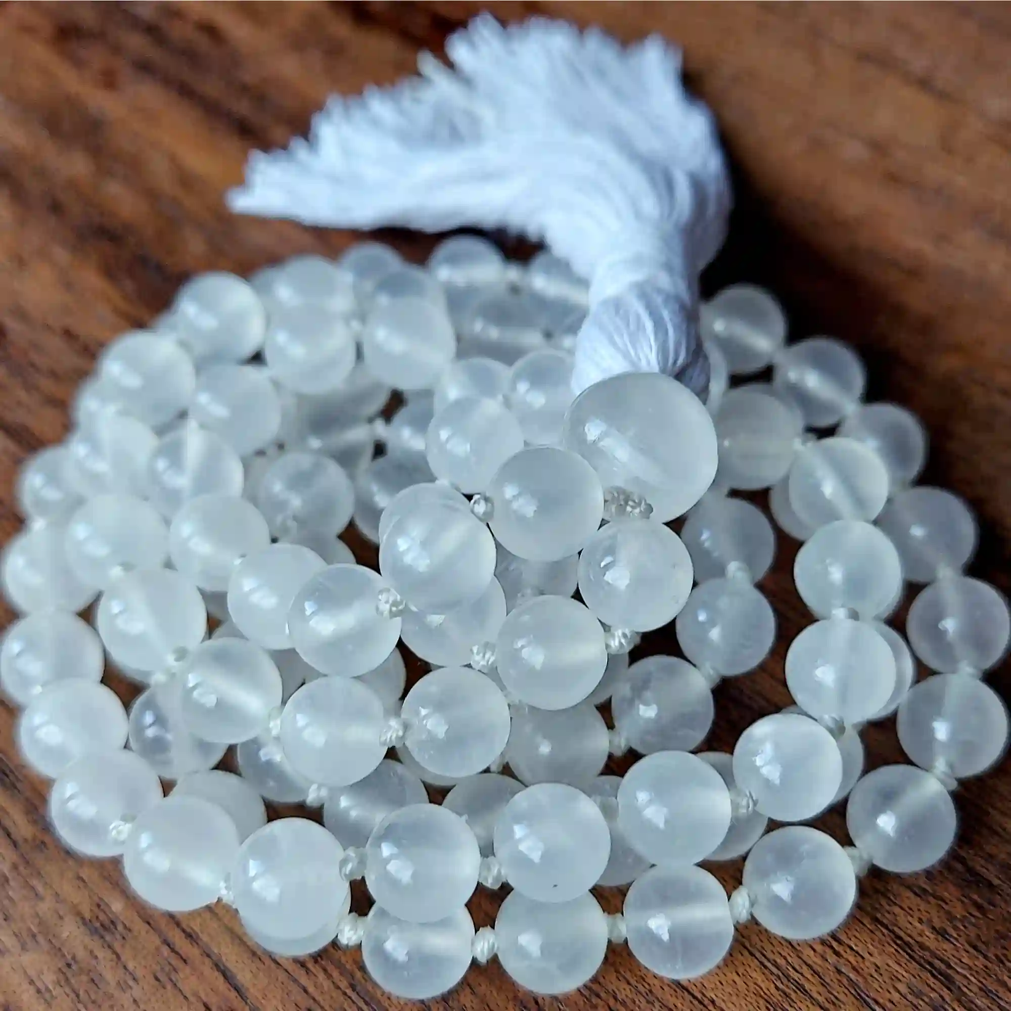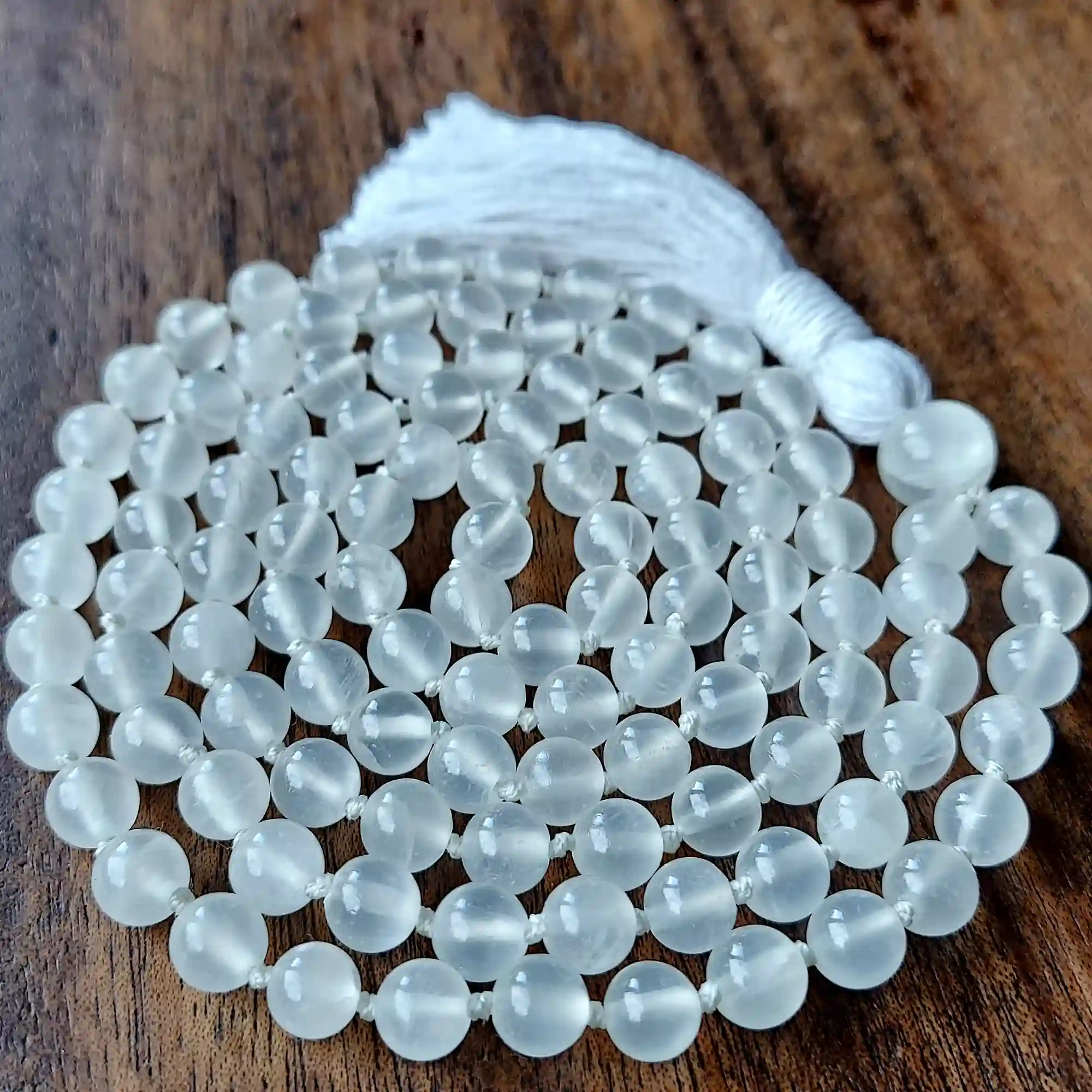 Your mala beads will include a cotton tassel and nylon cord for knots, which, unlike silk, does not rot, stretch, or fray. Cotton & nylon are far superior for something we handle and wear daily.