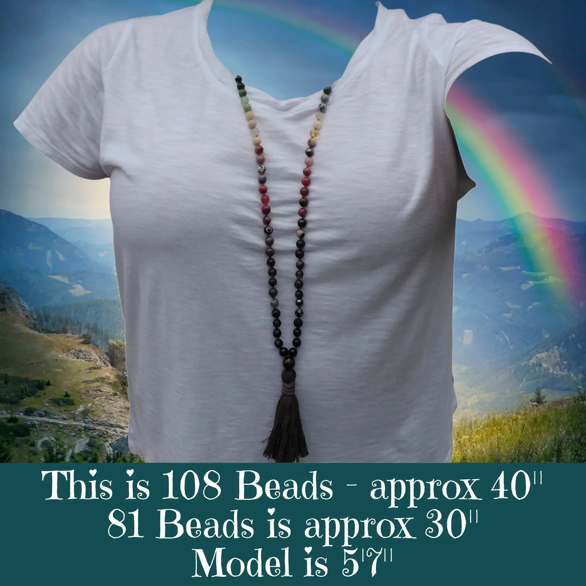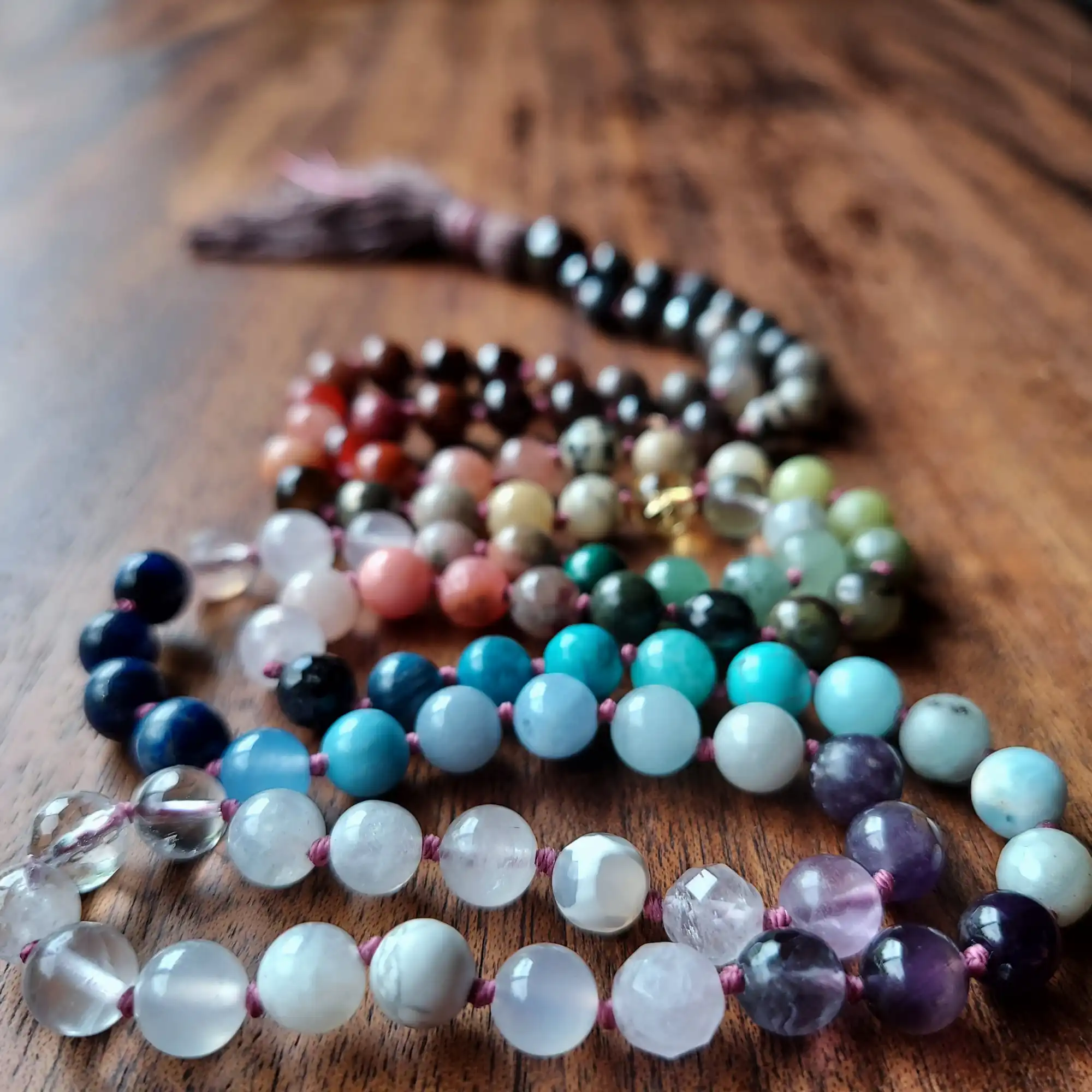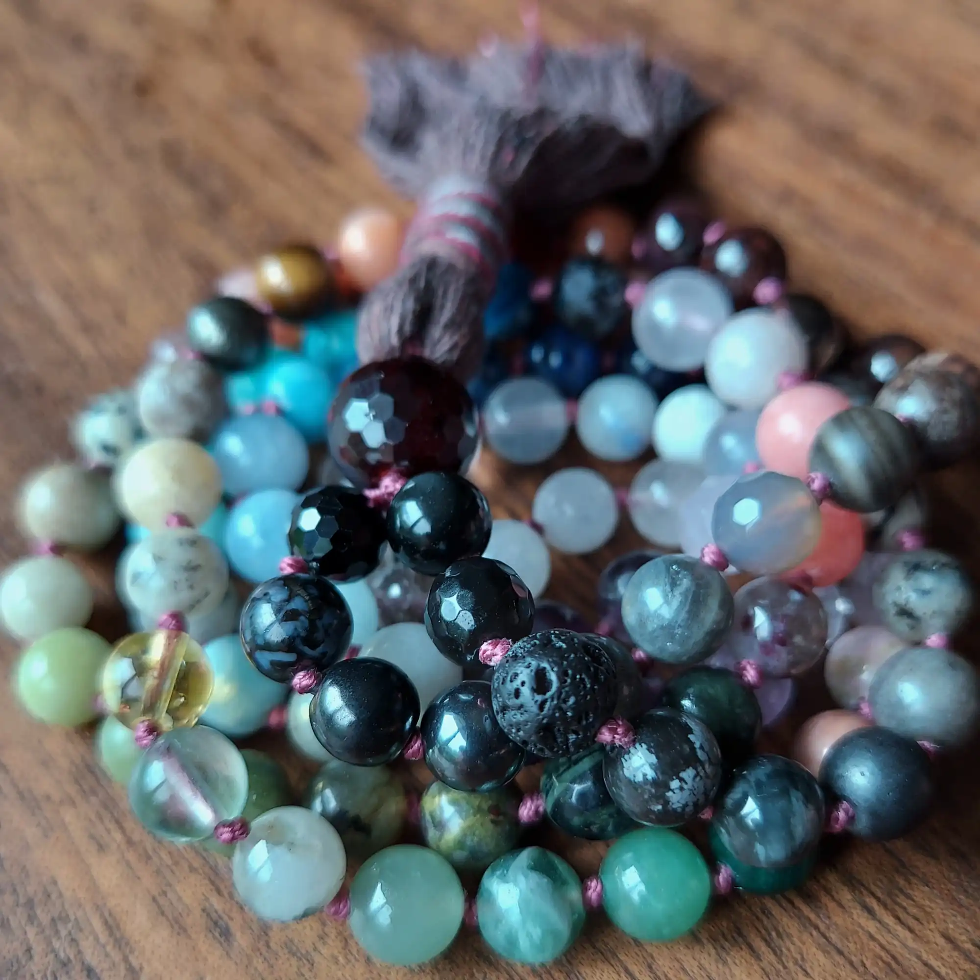 These mala beads are made of at least 81 different kinds of gemstone and crystal beads, including but not limited to Selenite, Shungite, Hematite, Pyrite, Moonstone, Aquamarine, Lepidolite, Auralite, Merlinite (Dendritic Opal), Mystic Merlinite (Indigo Gabbro), Garnet, Sunstone, Tiger’s Eye, Angelite, Citrine, Apatite, Peridot, Amazonite, Rhodochrosite, Sodalite, Lapis Lazuli, Aventurine, Turquoise, Prehnite, Amethyst, Labradorite, Ocean Fossil, Various Obsidians, Mixed Agates, Assorted Quartz, Varied Jades, Diverse Jaspers, and a Garnet Guru Bead.