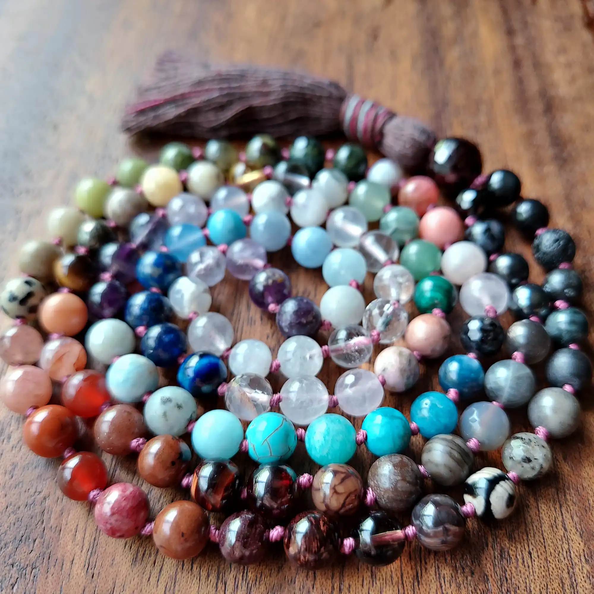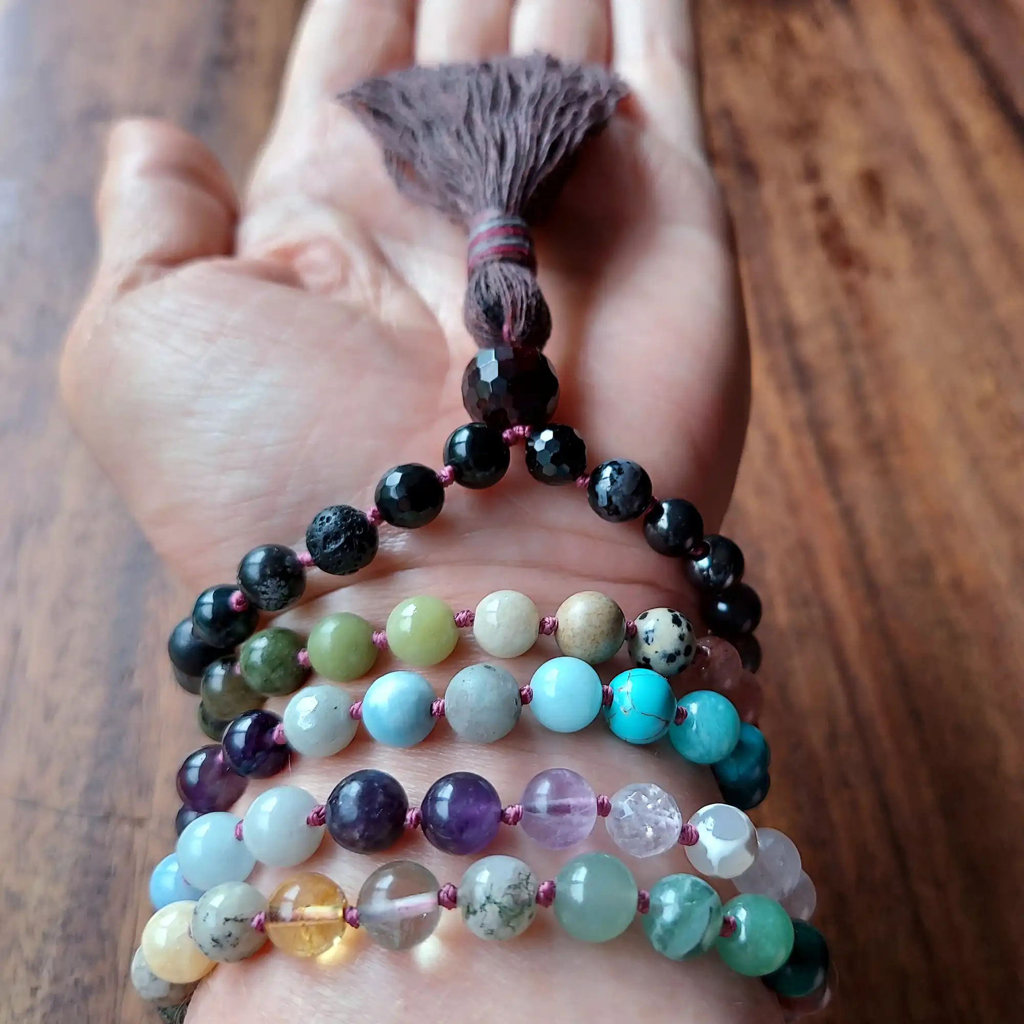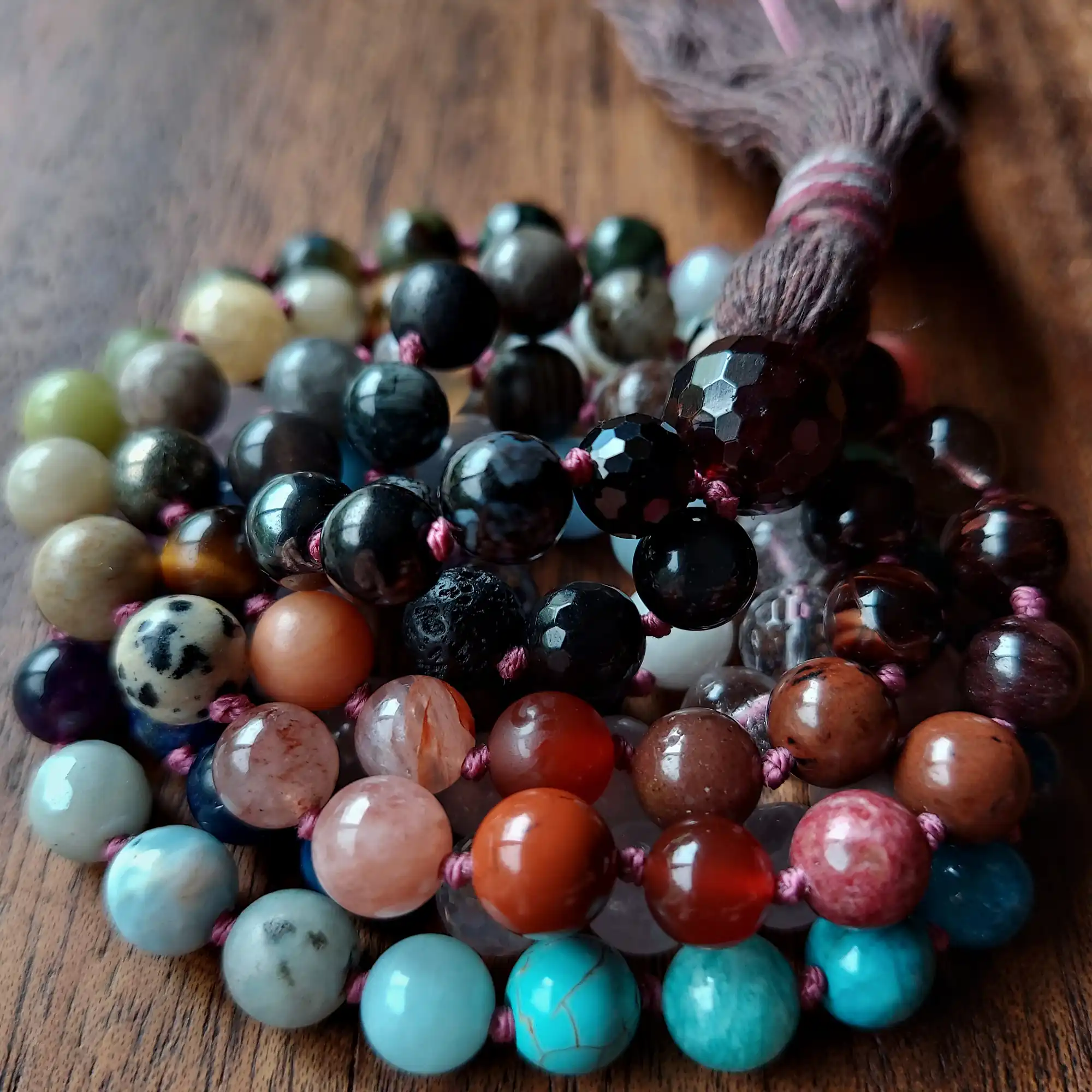 These mala beads are made of at least 81 different kinds of gemstone and crystal beads, including but not limited to Selenite, Shungite, Hematite, Pyrite, Moonstone, Aquamarine, Lepidolite, Auralite, Merlinite (Dendritic Opal), Mystic Merlinite (Indigo Gabbro), Garnet, Sunstone, Tiger’s Eye, Angelite, Citrine, Apatite, Peridot, Amazonite, Rhodochrosite, Sodalite, Lapis Lazuli, Aventurine, Turquoise, Prehnite, Amethyst, Labradorite, Ocean Fossil, Various Obsidians, Mixed Agates, Assorted Quartz, Varied Jades, Diverse Jaspers, and a Garnet Guru Bead.