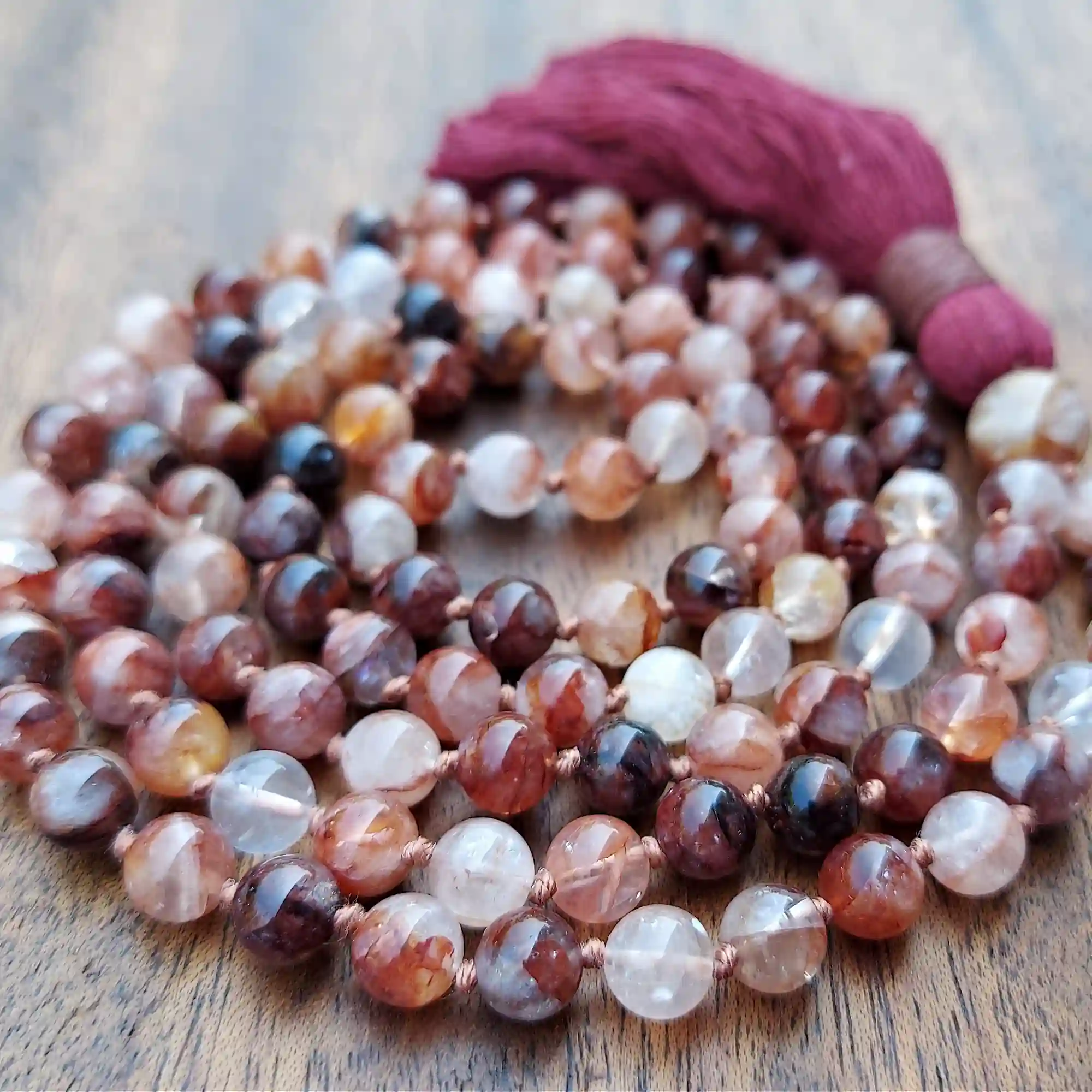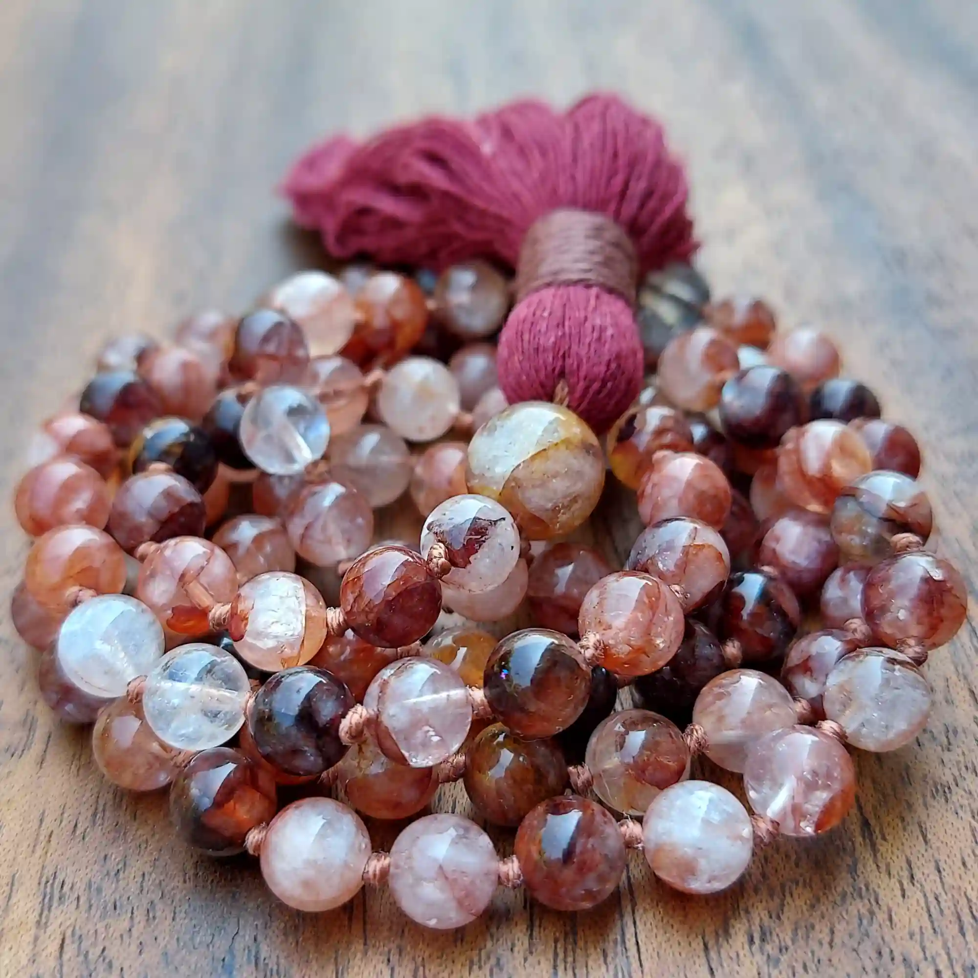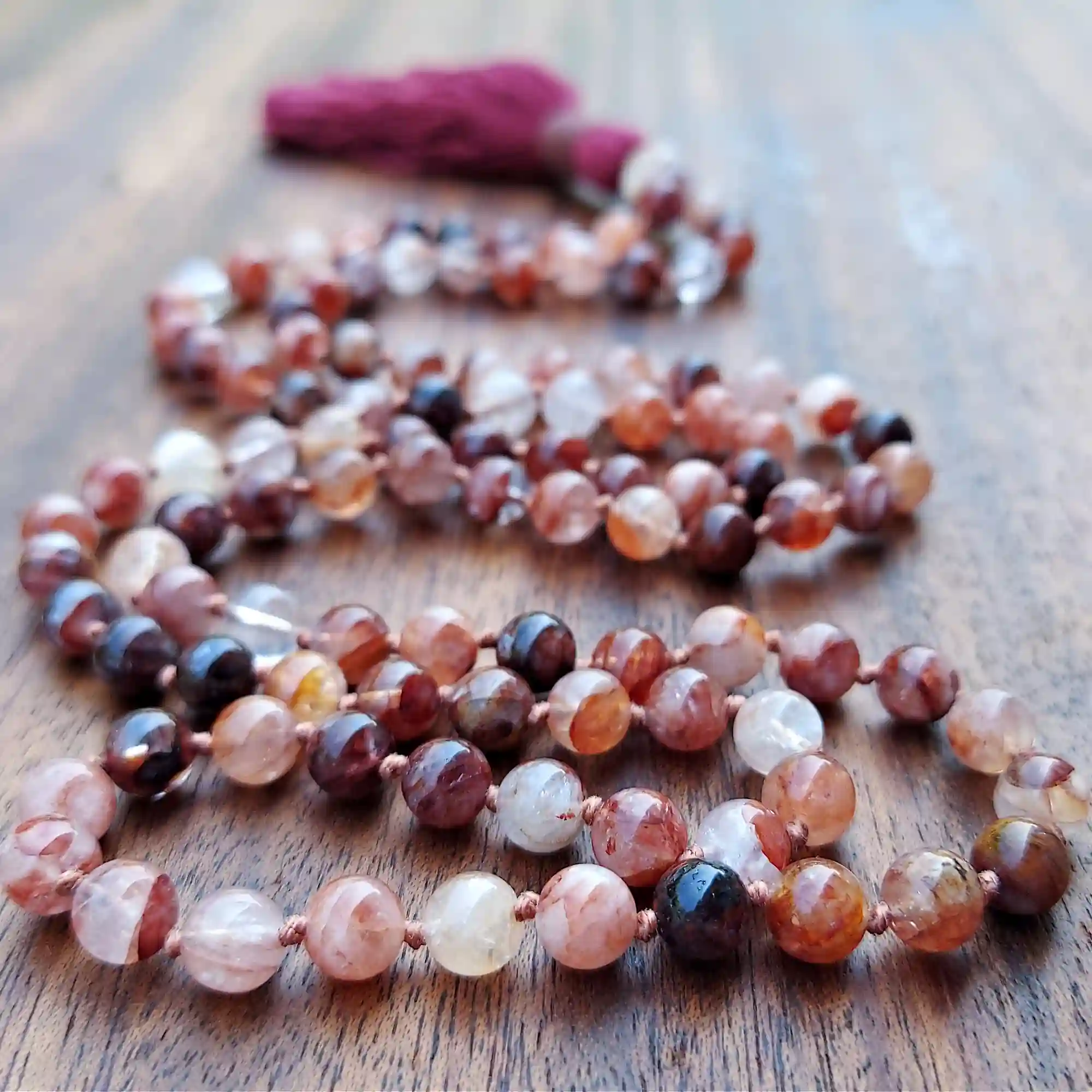 This stunningly beautiful Hematoid Quartz mala resonates with the Root, Heart, and Crown Chakras. Makes a wonderful gift for anyone wishing for love, healing, protection, clarity, vitality, and creativity in their life – and everyone else!