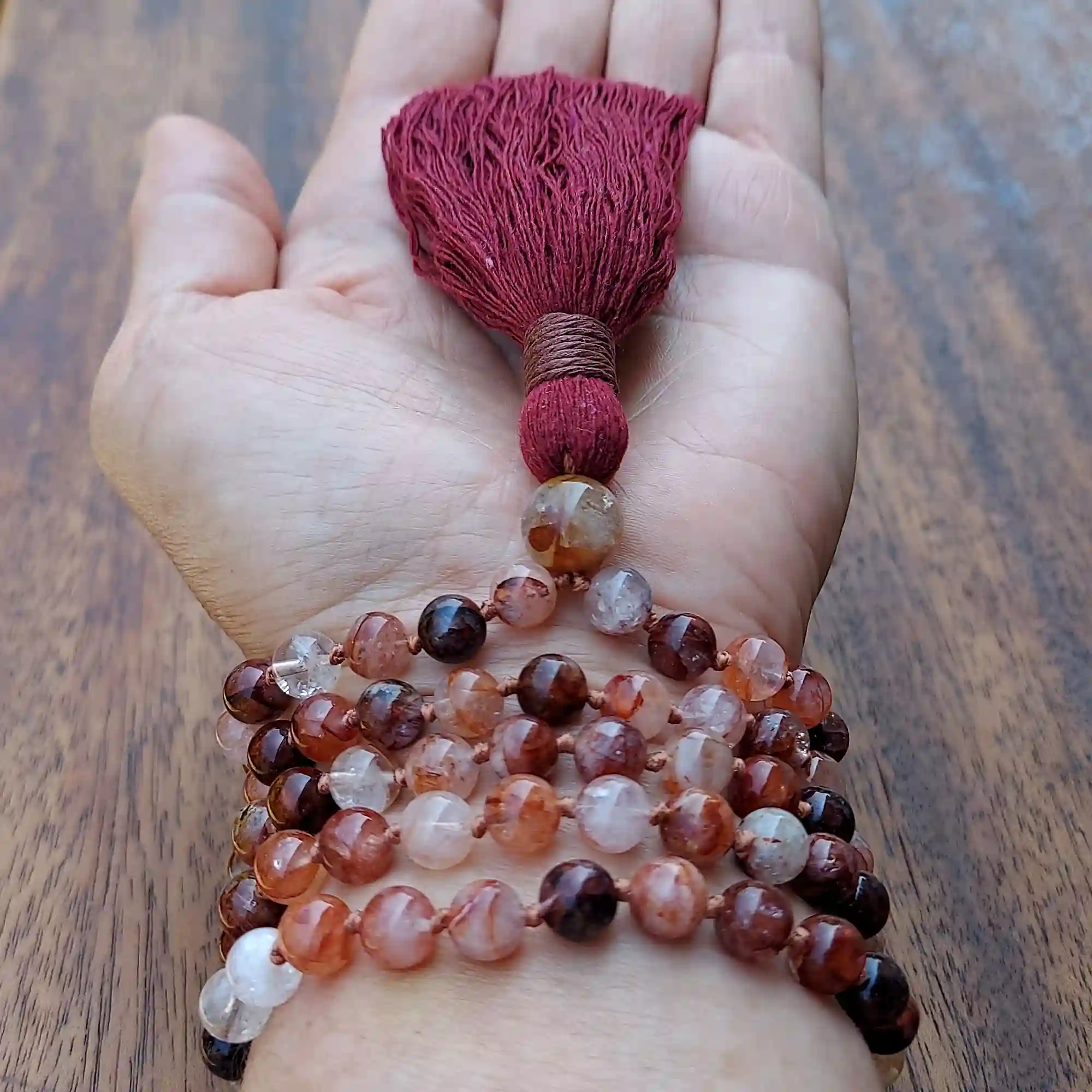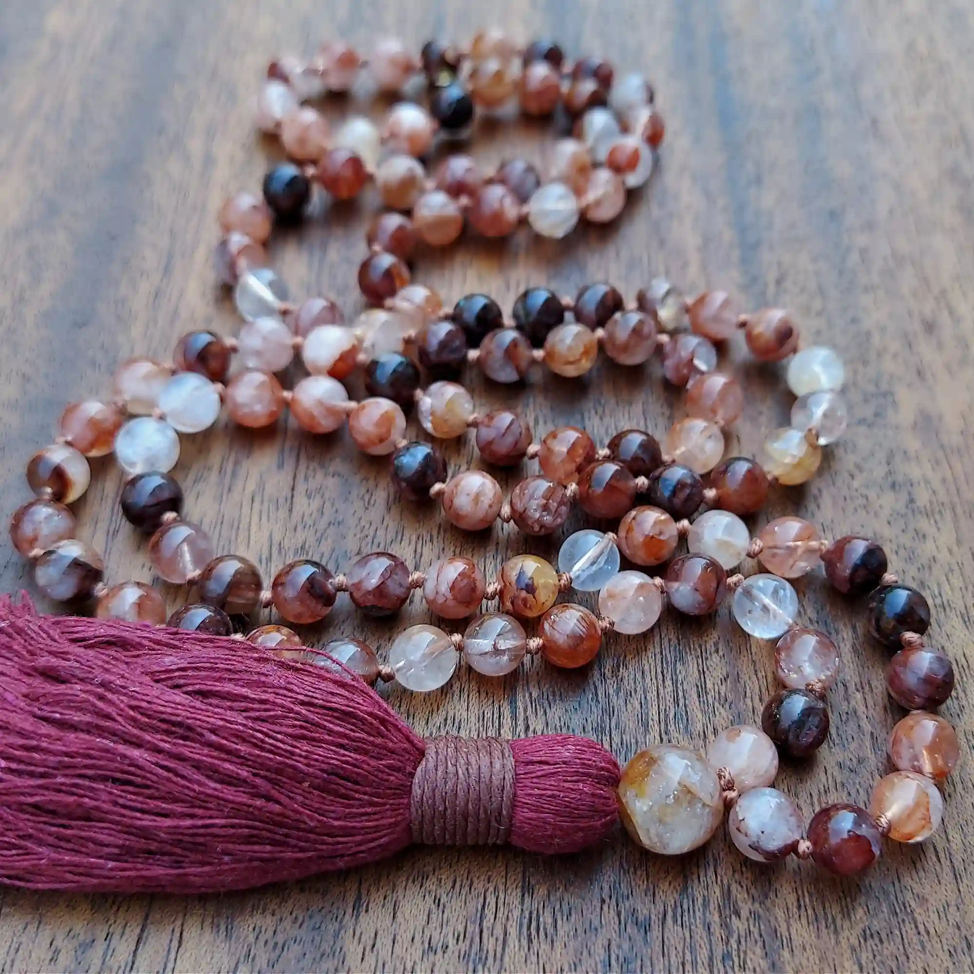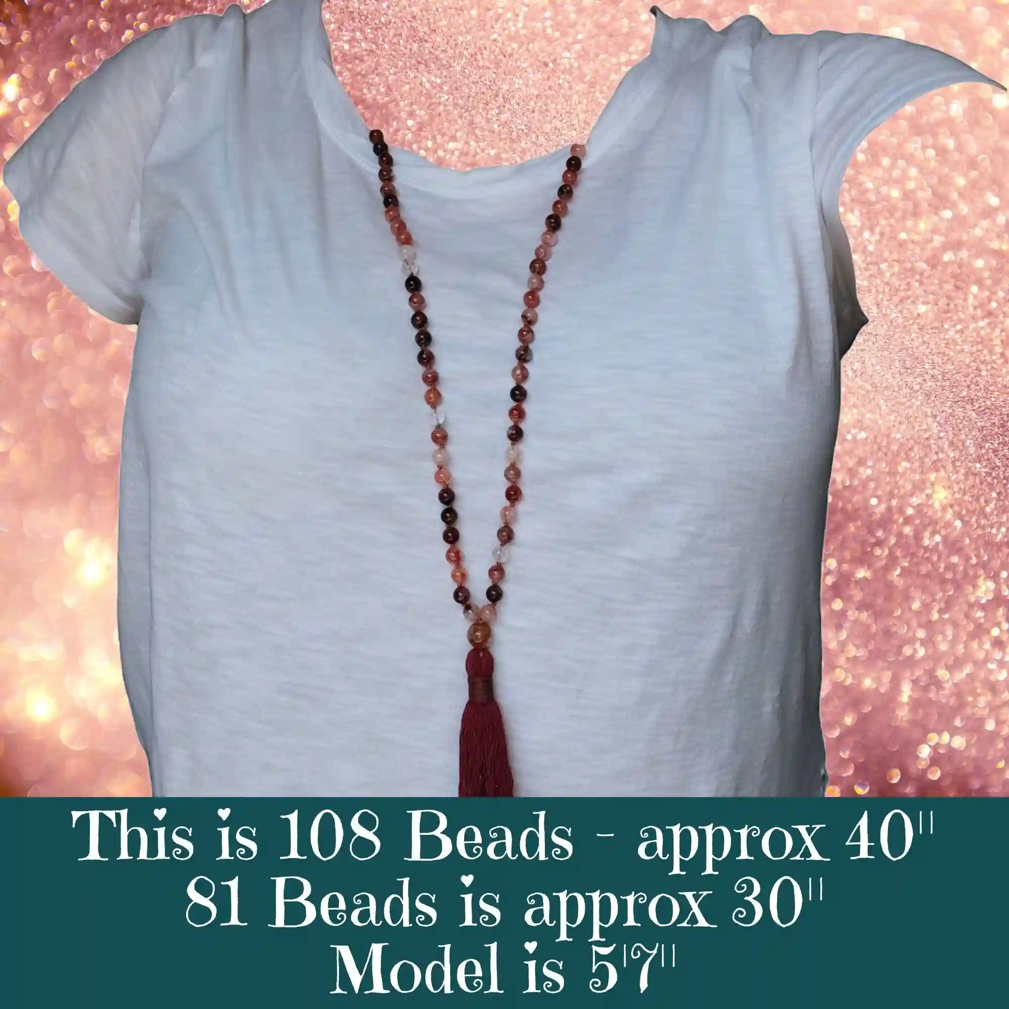 This stunningly beautiful Hematoid Quartz mala resonates with the Root, Heart, and Crown Chakras. Makes a wonderful gift for anyone wishing for love, healing, protection, clarity, vitality, and creativity in their life – and everyone else!
