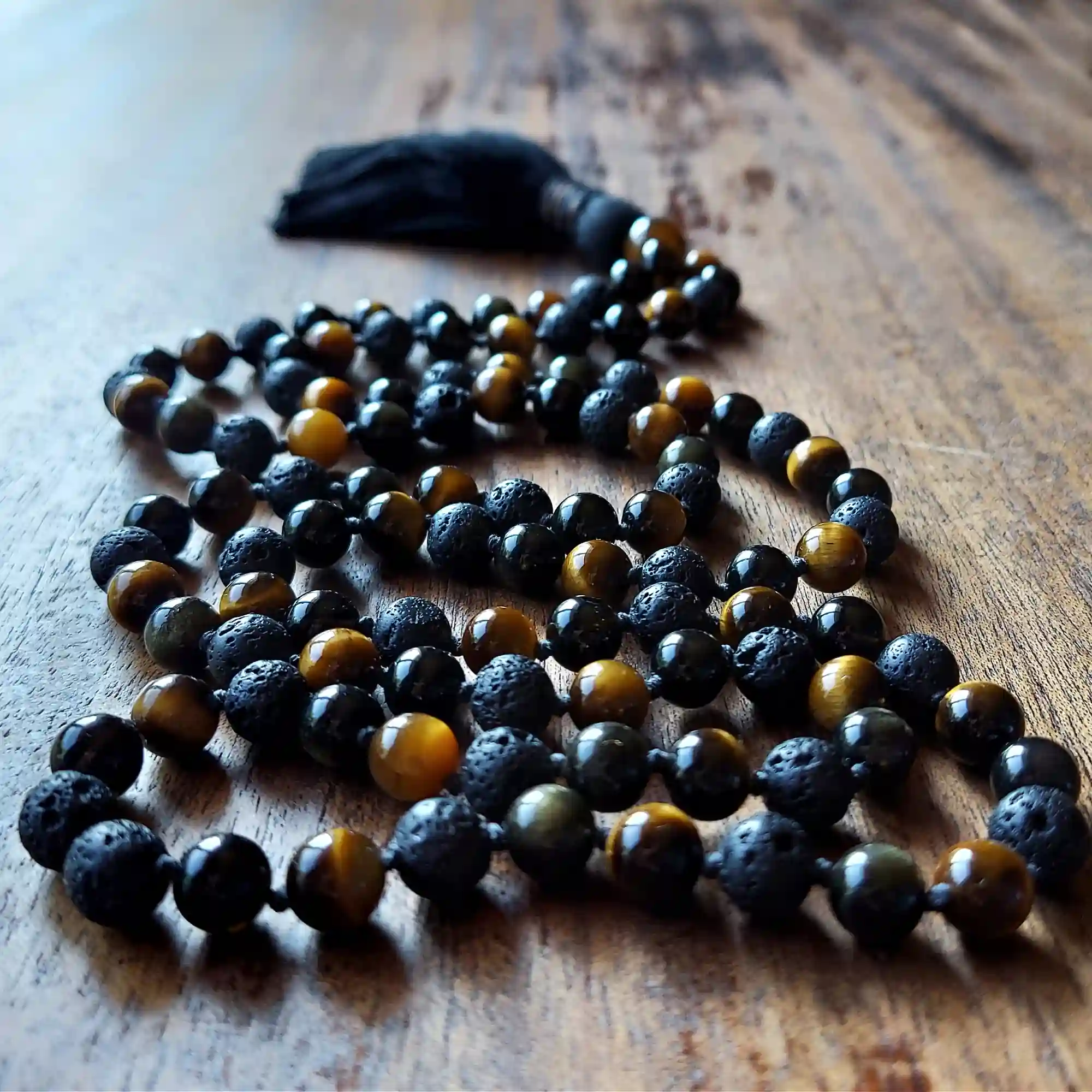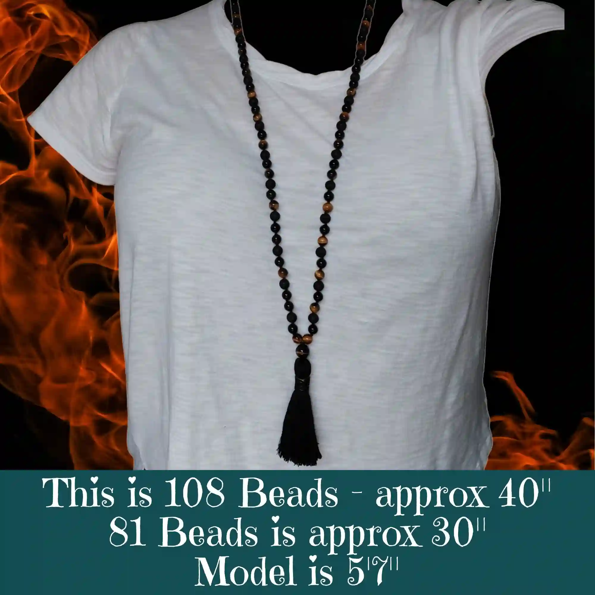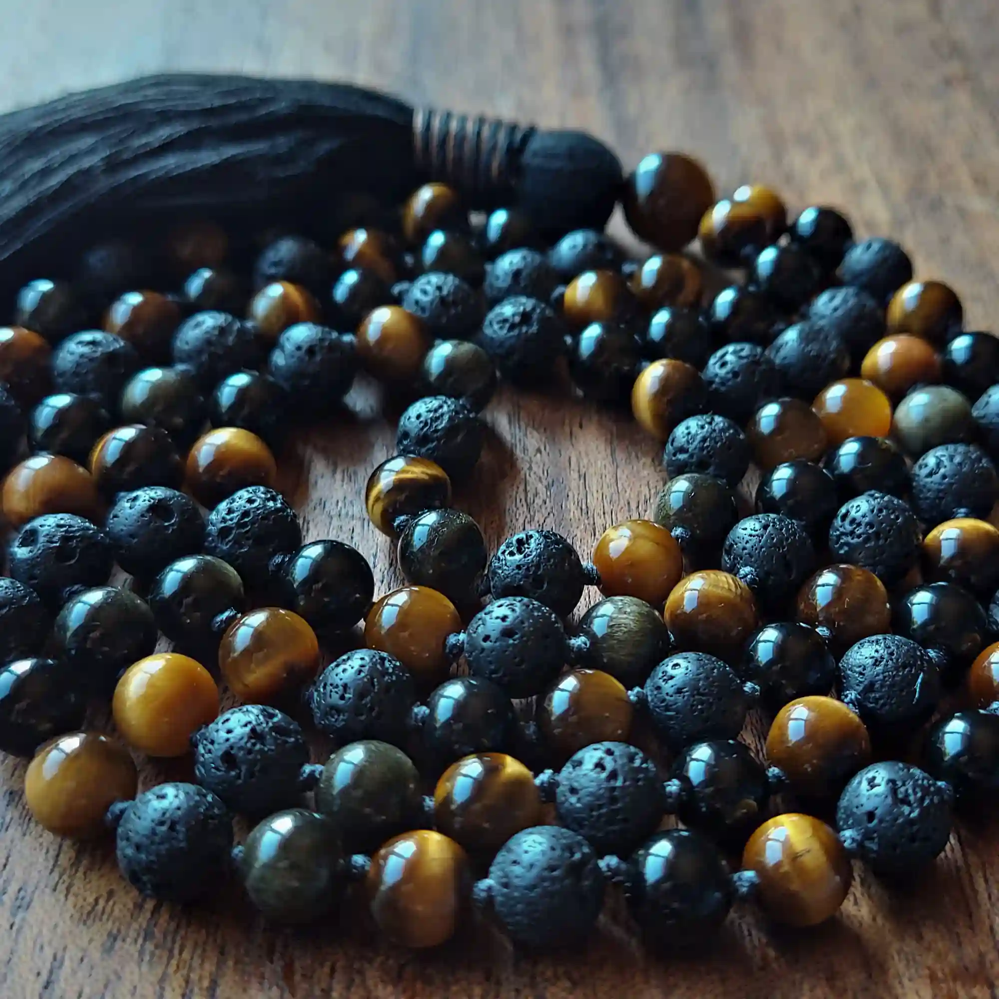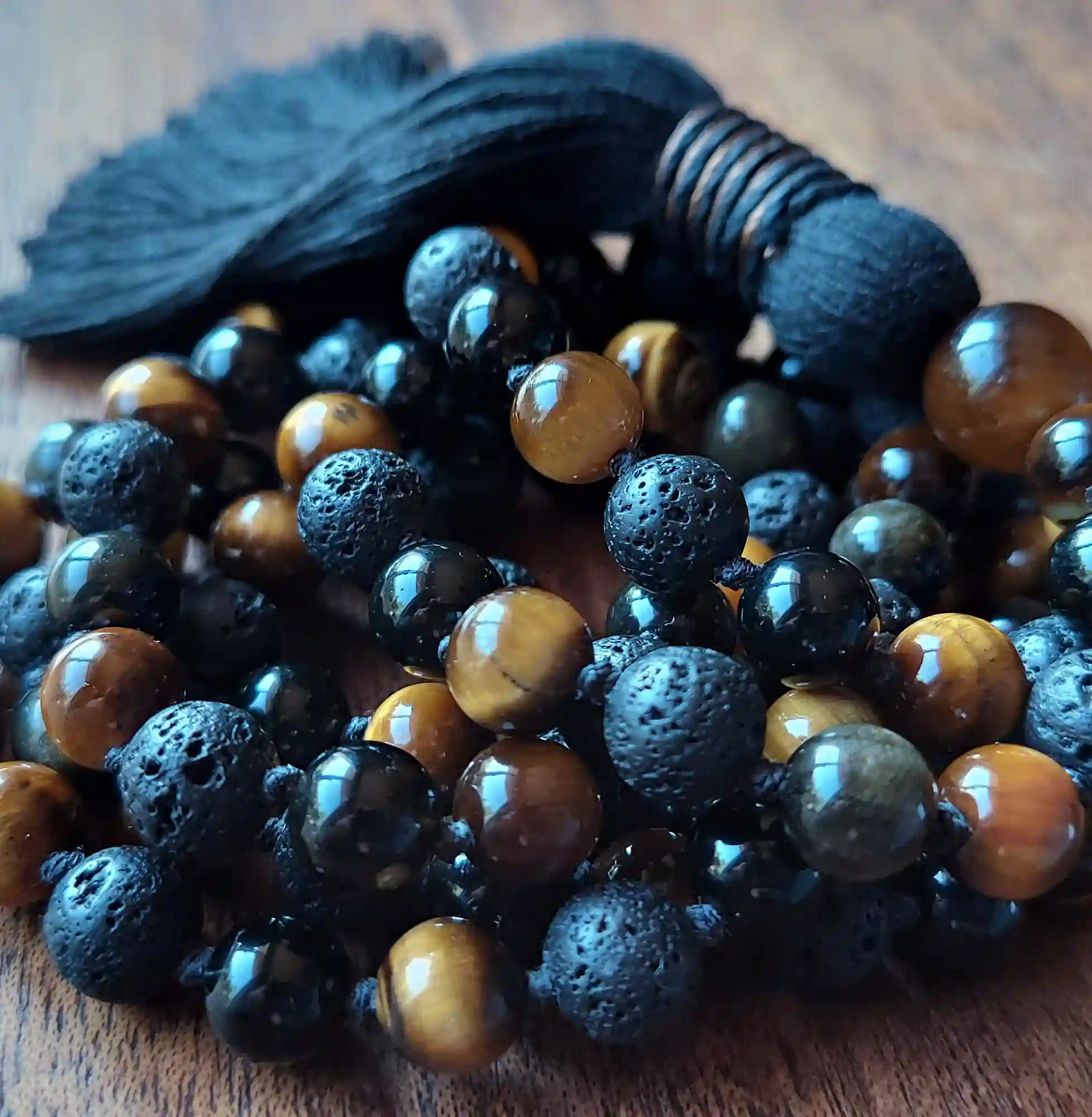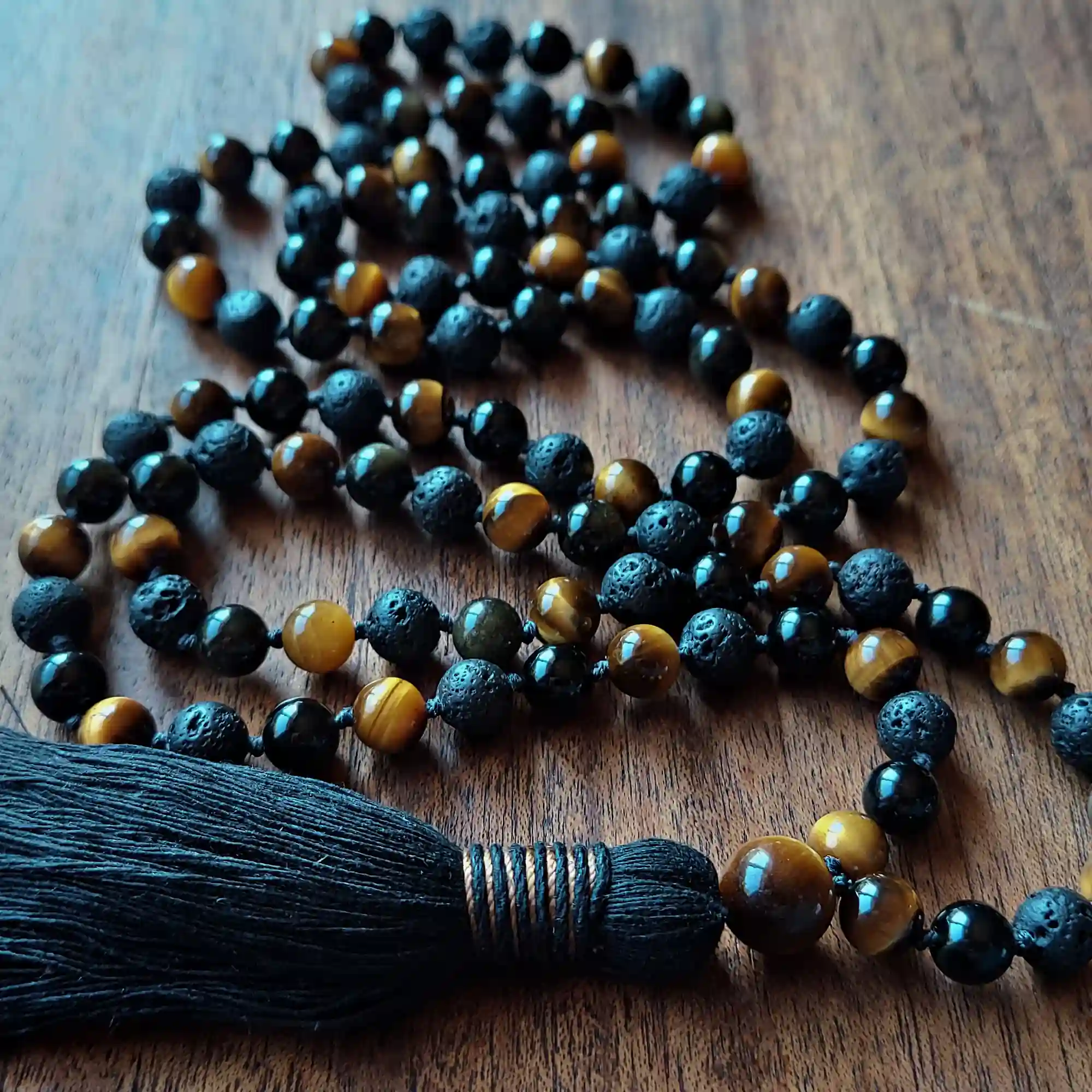 This beautiful Tiger’s Eye Mala Necklace includes Obsidian & Lava Stone to resonate with the Root Chakra, bringing courage & protection.