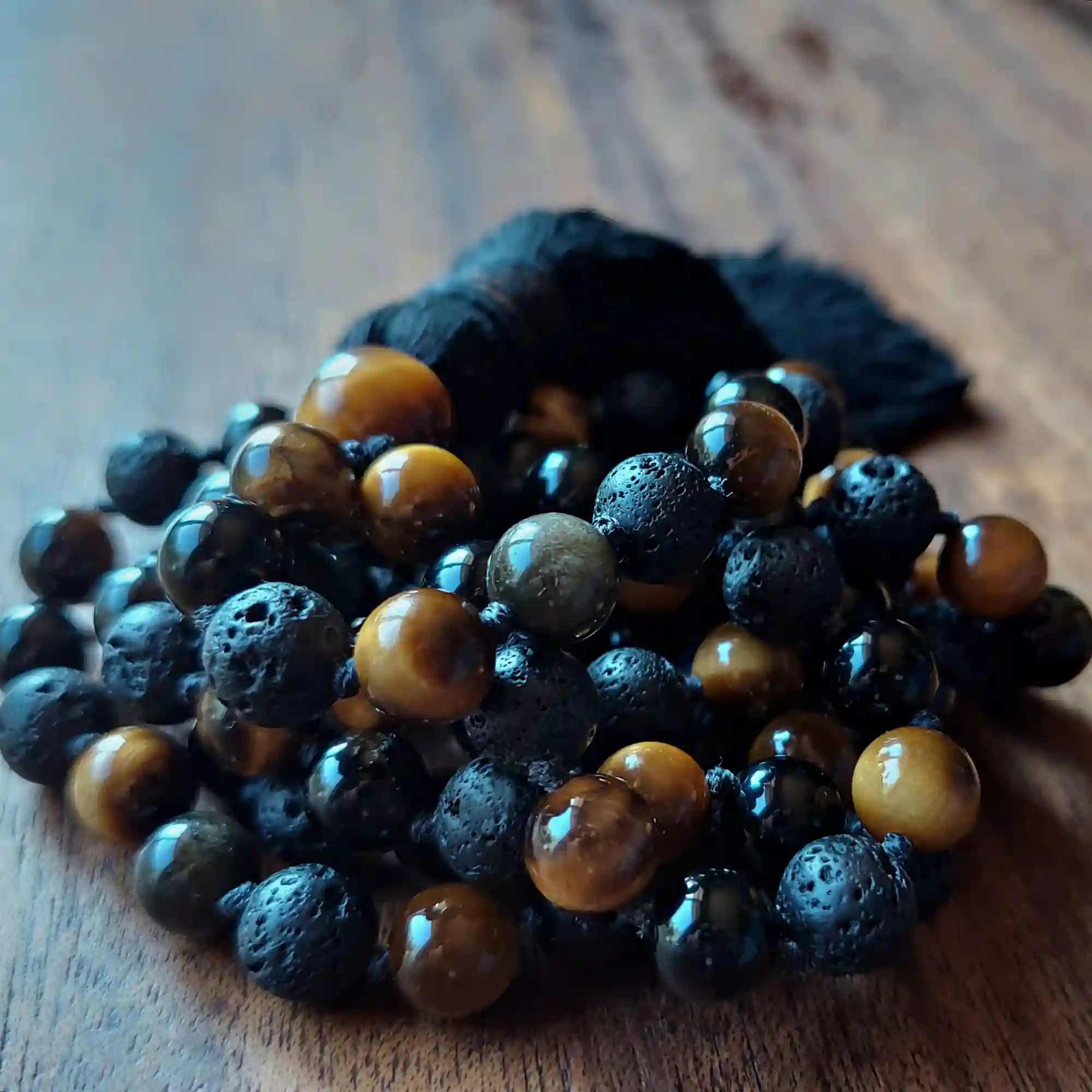 Obsidian and Lava Stone are created by fiery volcanic eruptions, fanning the flames of drive and will. Tiger’s Eye supports vision, focus, self-confidence, inner strength, and self-control. Eye of the Tiger.