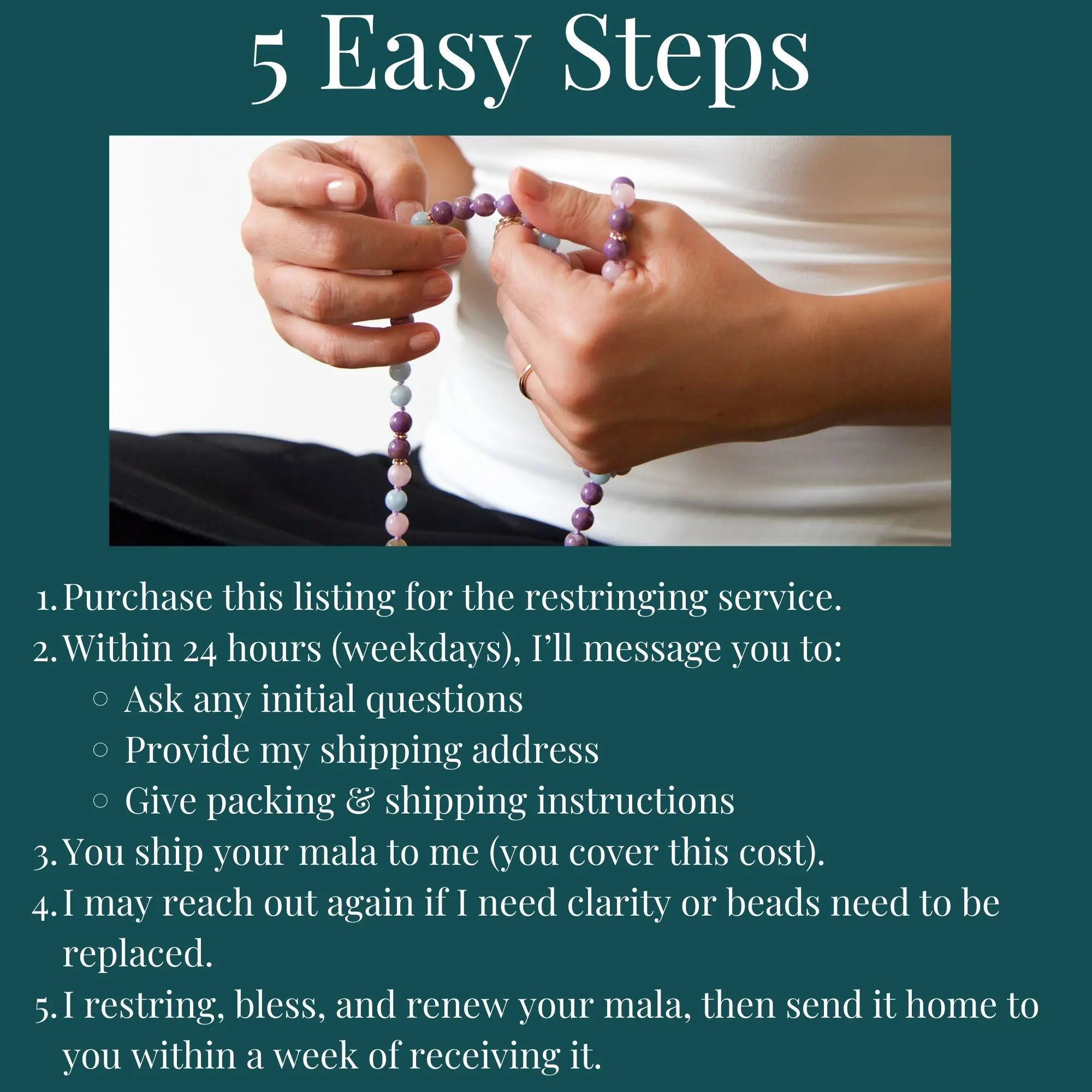 Includes free USPS Ground Shipping back to you. Once purchased, I’ll message you within 24 hours with shipping instructions. Your renewed mala will be ready to journey with you again within a week of my receiving it.